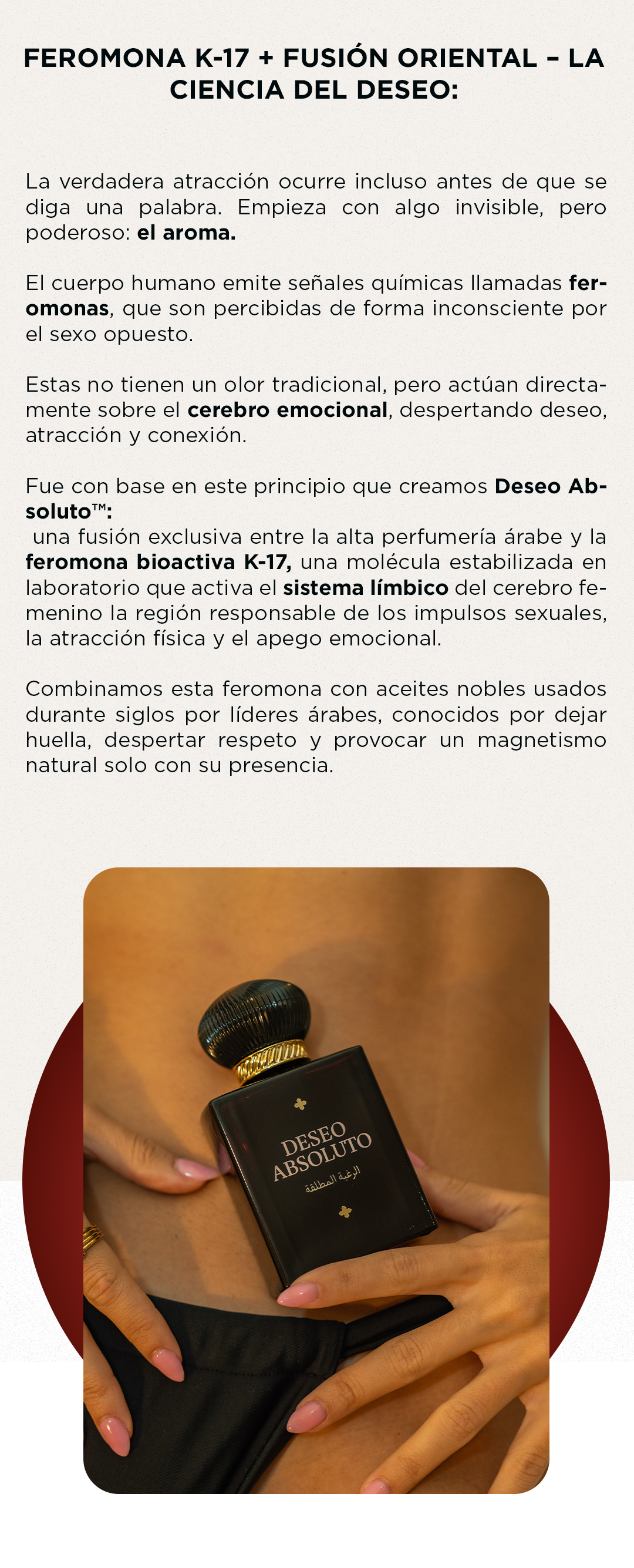 Buscaba algo premium y Deseo Absoluto superó mis expectativas. La piel lo mantiene por horas y se siente exclusivo. Varias chicas comentaron el aroma.