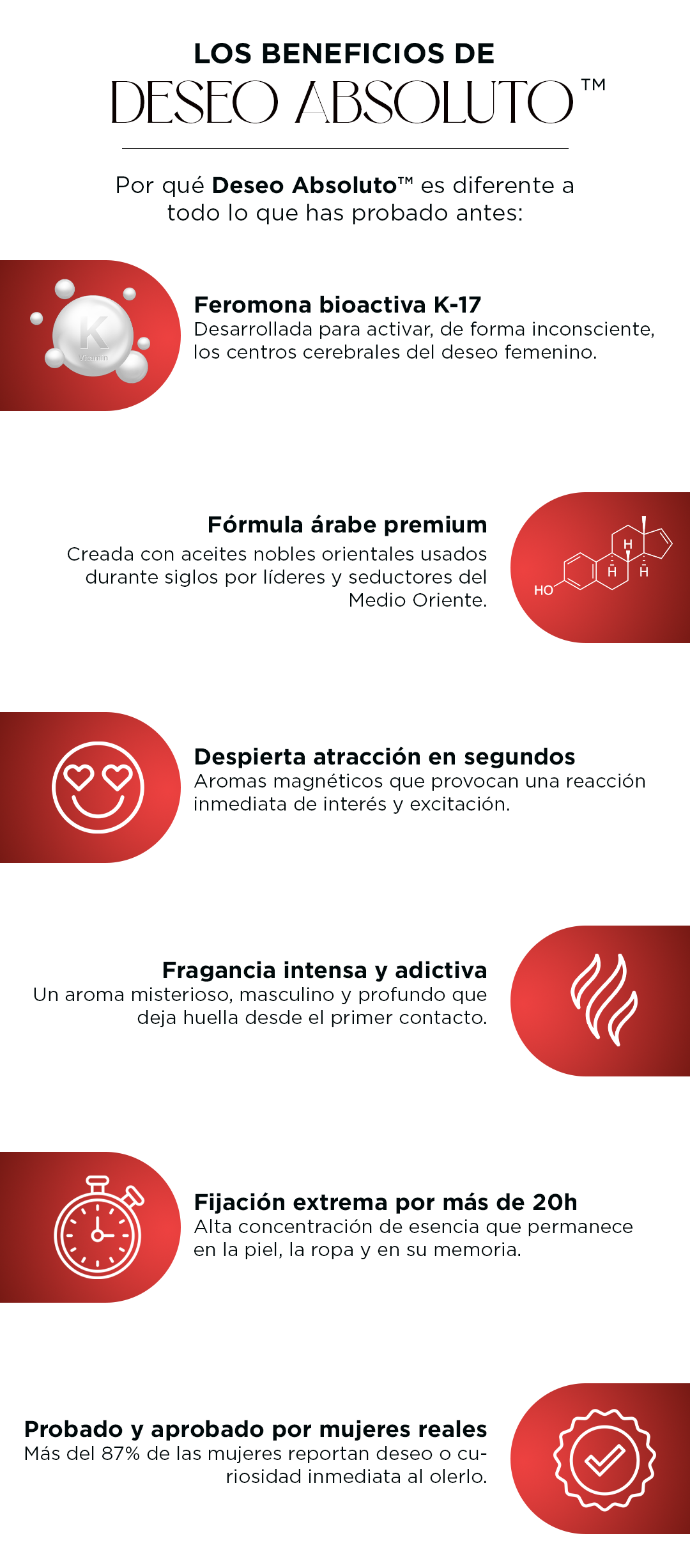 Compré Deseo Absoluto y quedé sorprendido: la fragancia es elegante y la atención que recibí fue evidente en una salida con amigos. Envío a Madrid en 48 horas y empaque impecable. ¡Efecto wow!